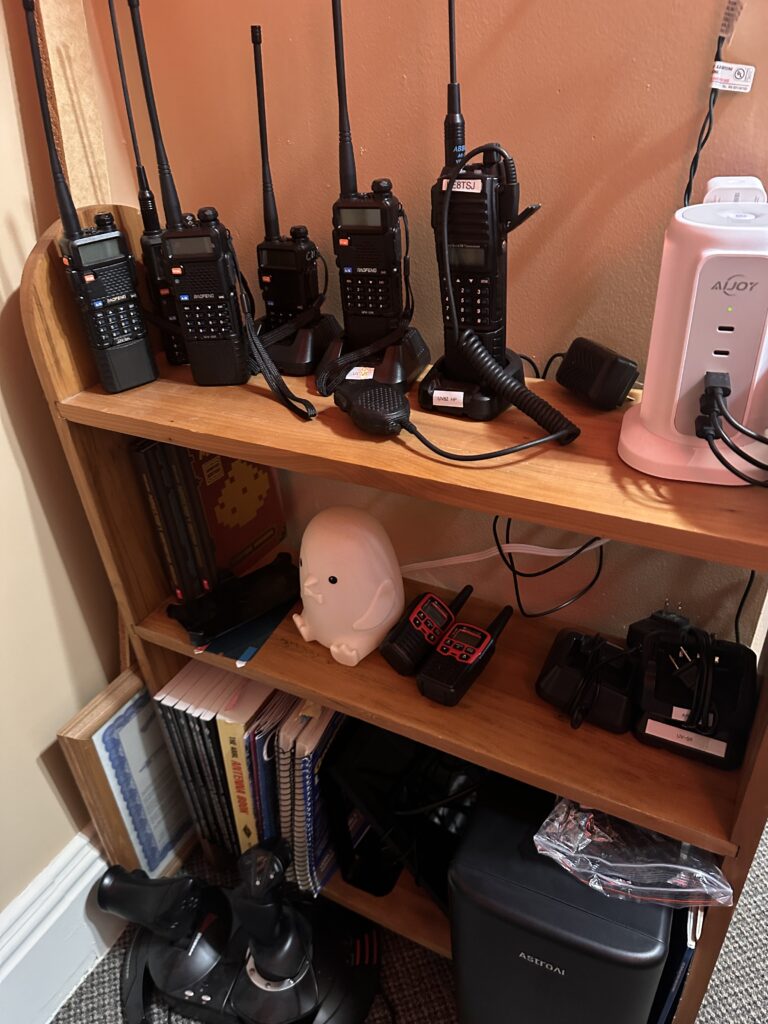 Transceivers & Tuner: Kenwood TS520SE w/ AT-230 antenna tuner, Yaesu FTdx 10,Yaesu FT-891 & FC-50 Tuner. HF antenna tuner: Palstar AT2KD. Amplifier: Ameritron HF linear amp. Mic: Heil mic w/boom. Antenna:Hexbeam Directional beam w/Yaesu rotor control, 2m Comet dual-band, Myantenna 8010, 20m EFHW. Digital: SignaLink USB. Odds n Ends: DMR Hotspot & Anytone HT, Baofeng, and Yaesu HT’s, Meshtastic LilyGo, Home-brew Powerbox.